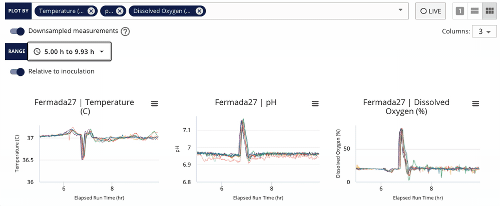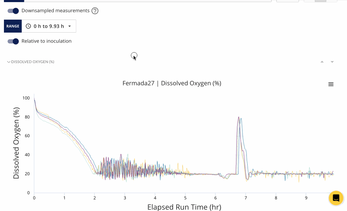 To browse different time points in your data, users can now use the Time Range Selector. This feature improves efficiency, especially when analyzing large amounts of data. This new feature allows users to manipulate the viewable area of a graph with a couple of clicks. Users can also switch between elapsed run time (relative to inoculation), or absolute date/time by using the toggle.